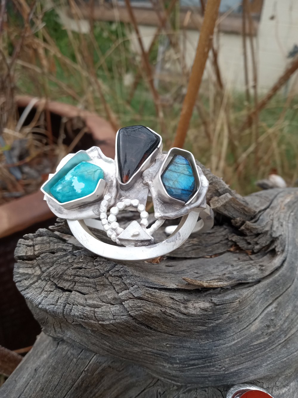 Heavily etched and detailed all over. Labadorite, Blue Hawk eye and turquoise stones take the stage.